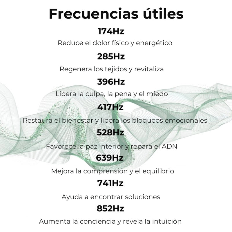El dispositivo emite frecuencias mediante un campo electromagnético pulsado (PEMF). También puedes escuchar estas frecuencias a través de auriculares o altavoces conectados.